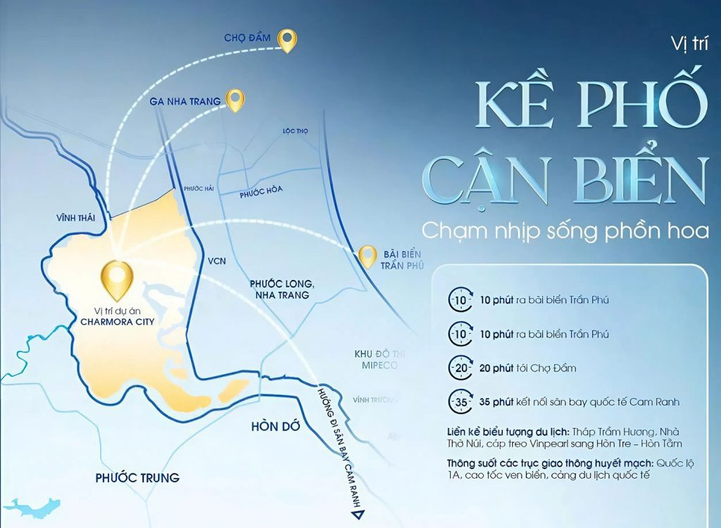 Tọa lạc tại phường Nam Nha Trang, khu vực được định hướng trở thành trung tâm hành chính – kinh tế mới của thành phố biển, Charmora City sở hữu vị thế vàng ba mặt giáp sông hiếm có tại Việt Nam. Dự án nằm giữa dòng sông Quán Trường và sông Tắc, tạo nên thế đất “Tứ thủy triều quy – Tứ thú tụ linh” – biểu tượng phong thủy mang lại vượng khí, tài lộc và thịnh vượng cho cư dân.