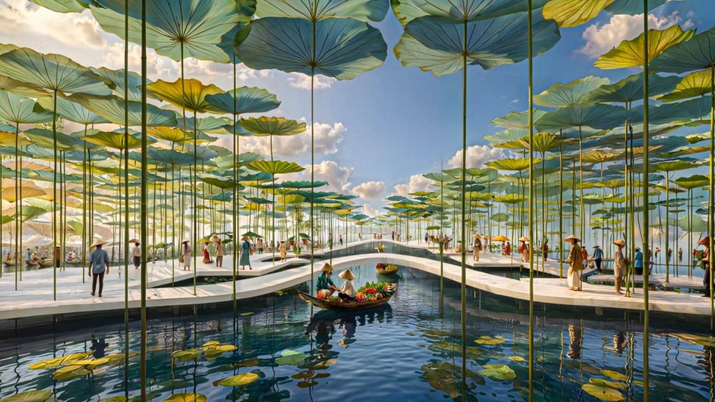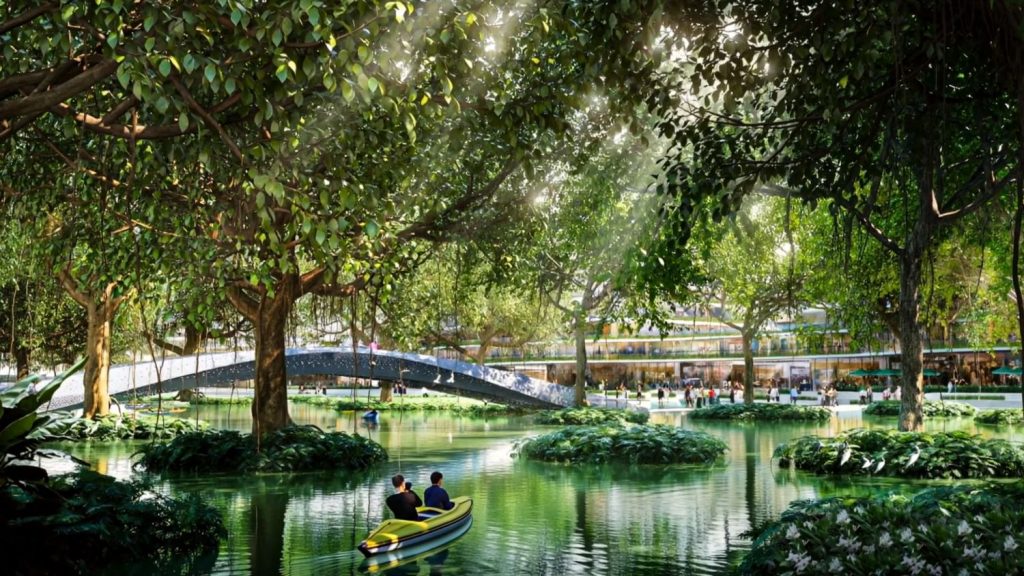 Mỗi con đường, mỗi khu cảnh quan đều được thiết kế hài hòa giữa kiến trúc hiện đại và hệ sinh thái mặt nước, tạo nên một thành phố cân bằng giữa con người – thiên nhiên – công nghệ.