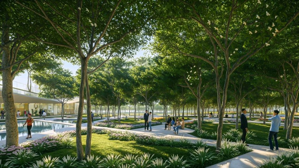 Công viên ven sông, hồ điều hòa, đường dạo bộ sinh thái – nơi con người hòa mình cùng thiên nhiên trong lành.
